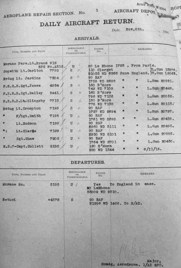 Many aircraft had been purchased from French manufacturers prior to the war and the majority of engines were of French design. Upon arrival in France the Expeditionary Force set about acquiring further supplies. Unfortunately poor records were kept of the early acquisitions.