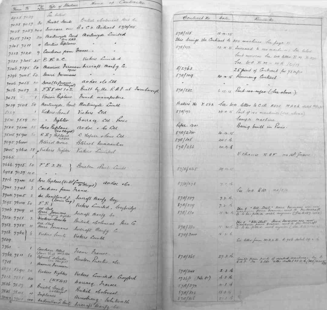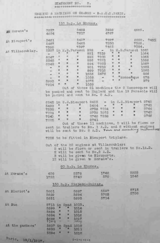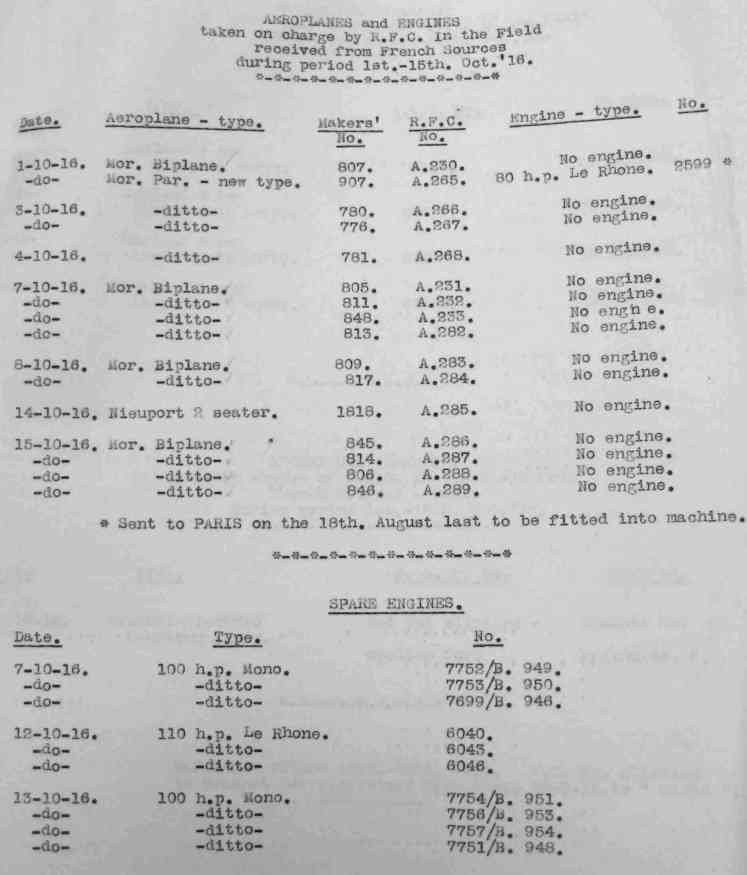 During 1915 a British Aircraft Purchasing Commission was established in Paris and produced weekly reports. These only quote French serial numbers as the RFC serial was only allotted when the aircraft was delivered to the Aircraft Park or England.