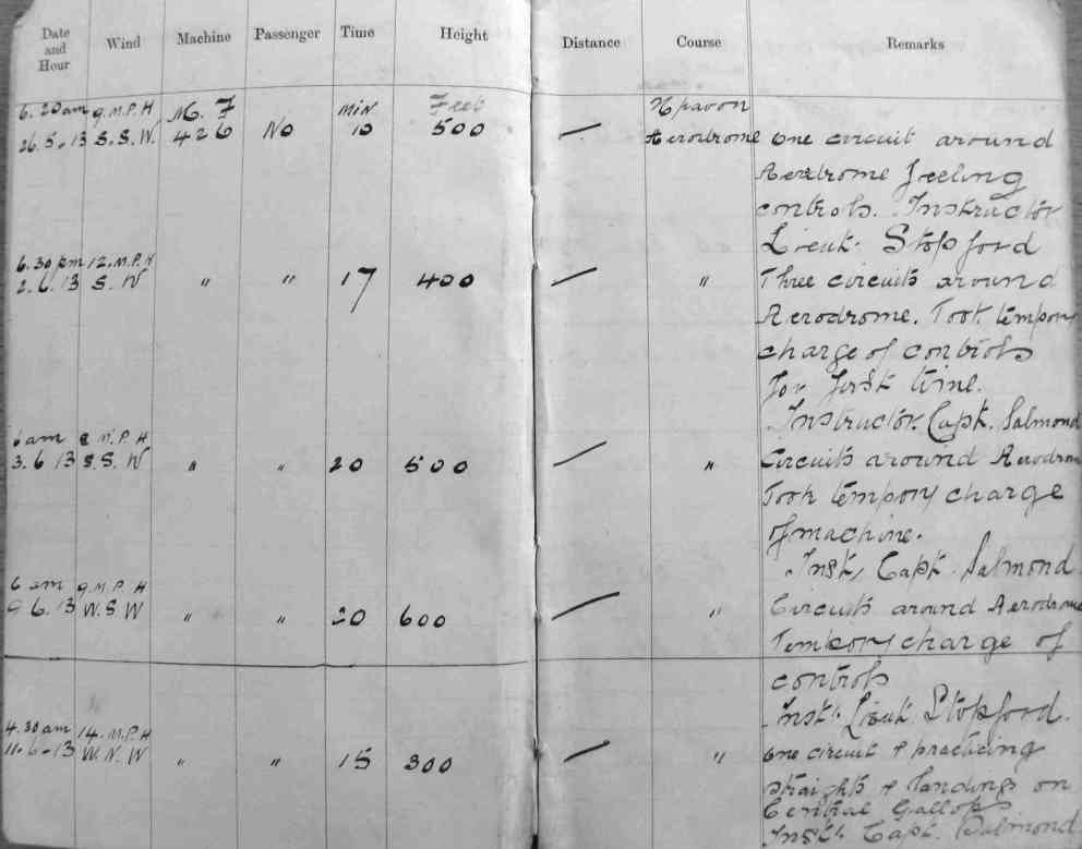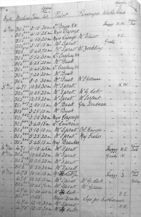 A log was maintained of all the flights from the aerodrome, the surviving books commencing on the 14th May 1914.