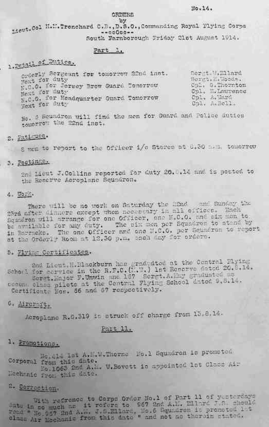 Each unit of the RFC/RAF prepared Daily Routine Orders showing the activities for the day, changes in personnel and equipment, and other notices. These give an interesting insight into daily activities but also reinforce the information contained in the daily and weekly reports. For some units, particularly those in the UK and in non-Western Front theatres of War the RO's are the only surviving source of information. Because each unit in the hierarchy prepared RO's there is significant duplication of reporting: there would be a RO at the HQ, Wing and squadron level. This can be useful in helping to resolve errors and filling gaps.