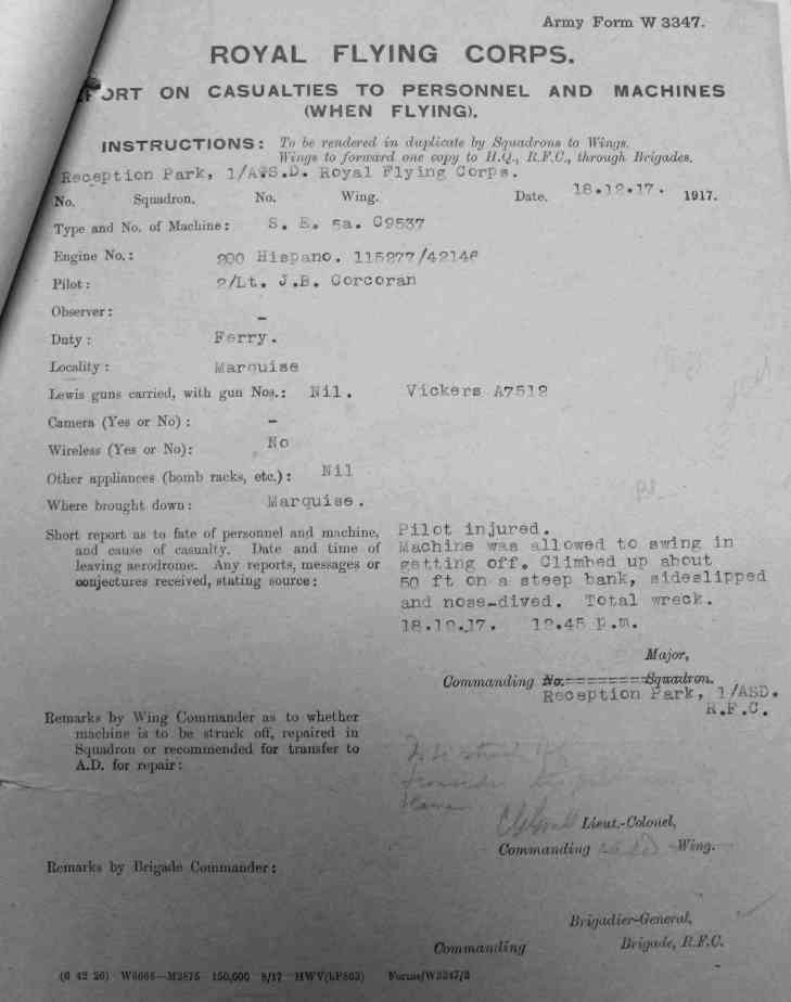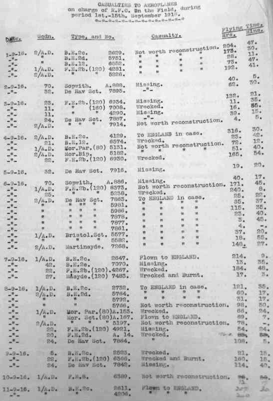 Loose leaf sheets were typed each day by RFC HQ in France listing serious casualties to personnel while flying. Minor injuries not requiring hospital treatment were normally excluded.