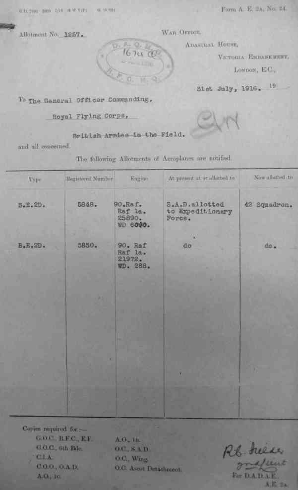Once an aircraft had passed inspection by the Aircraft Inspection Department ('AID') it was handed over and allotted to a particular branch: the Expeditionary Force, Central Flying School, Home Defence, Training or other unit. The specific squadron would not normally be identified on the allotment instruction. Allotments were initially given a sequential number, prefixed 'A' for aircraft ('T' being used for transport). The individual allotment sheets appear in a large number of bulky files covering the period from September 1914 to April 1919.