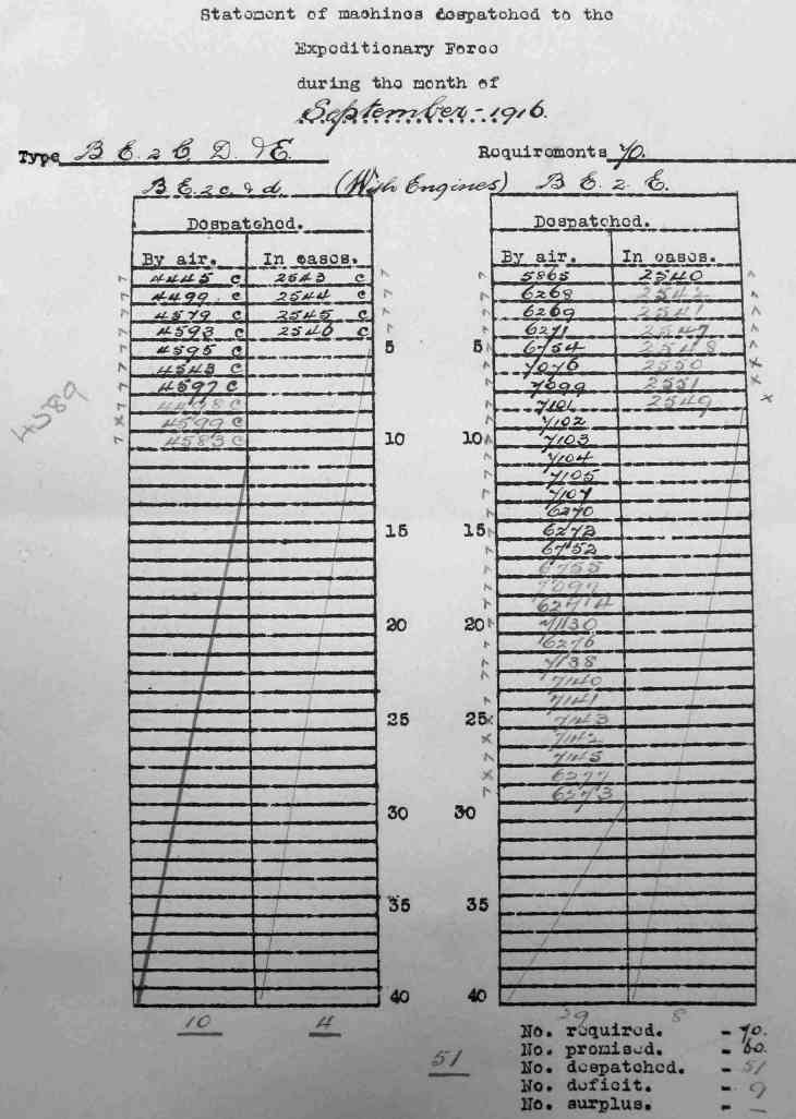 Schedules of aircraft despatched to the Expeditionary Force were prepared monthly. These comprised a summary sheet showing despatches of aircraft of each type against the number requested, and individual sheets by aircraft type listing the serials of aircraft sent. Lists for the period January 1916 to May 1918 survive.