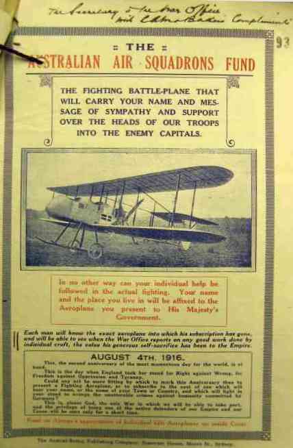 During the war individuals and groups around the Commonwealth were invited to contribute a nominal sum towards the war effort in return for which an aircraft would be inscribed with a name of their choice. In the event of the aircraft being destroyed the name was transferred to another machine. Details of presentation aircraft appear in the Cross and Cockade journals Volume 14 No.2 and Volume 20 No.2, and the book 'Gifts of War'. Original records appear in the TNA files AIR 1/14, AIR 1/142, AIR 1/651 and AIR 1/903.