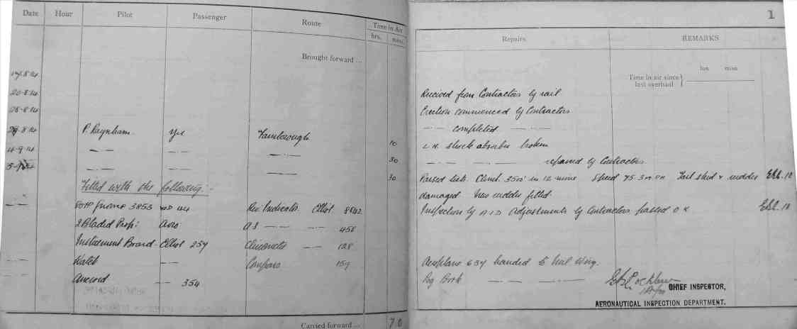 Each aircraft had a log book in which all flights were recorded along with the name of the crew. Following a number of early accidents involving aircraft that had been badly repaired, it was also a requirement to document all maintenance work in the book.