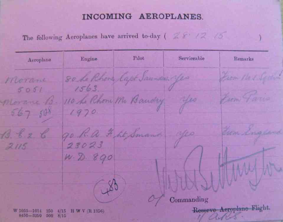 In France, aircraft were delivered to one of the Aircraft Parks, the principal ones being 1AP at St Omer (known as 1 Aircraft Depot from 13.12.15) or 2AD at Candas (originally 2AP in England) from where they were distributed to squadrons.