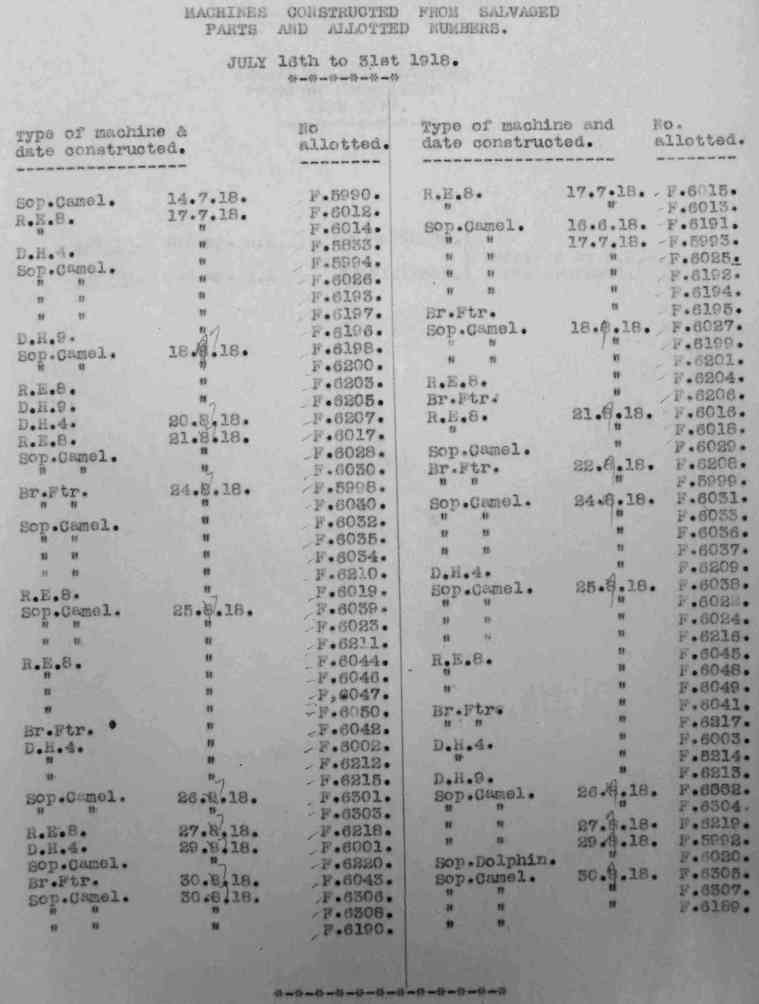 The repair and reconstruction of aircraft at the Aircraft Depots represented a significant source of equipment supply. Aircraft reconstructed from parts would be given a new serial, and in some cases the original airframe number would be identified.