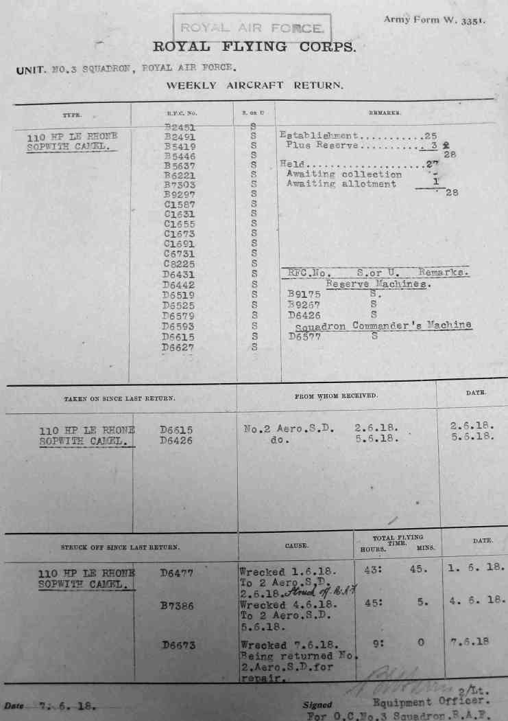 Squadron Quartermasters (often referred to as 'Q' branch') or Equipment Officers maintained a record book recording all the equipment held by the squadron: aircraft, engines, guns and motor transport. A few of these books have survived.